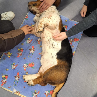 Sist, men ikke minst, fikk jeg treffe Nina og hennes basset hound Bosse. Bosse hadde hvilepuls, og tok livet med ro. Det var flere studentgrupper å treffe denne dagen, og Bosse virket trygg og rolig med alle. Studentene ga tilbakemeldinger om at det var godt å se at Bosse var så rolig, det gjorde noe med dem også.